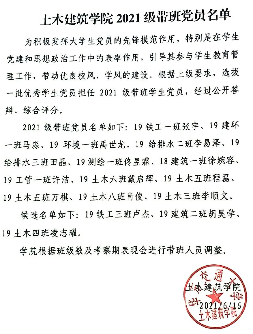 2020年6月,经过严格筛选出的13名党员,根据个人带班表现,辅导员打分,班级评分,负责老师评分综合评定,经研究,表彰2020级土木7、8班带班党员葛竞、2020级工程管理专业带班党员曲辰昊、2020级建筑学专业带班党员冯朝熳、2020级建环专业带班党员李语溪为2020级优秀带班党员。
