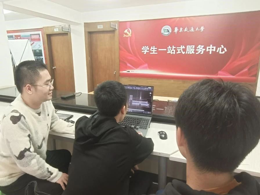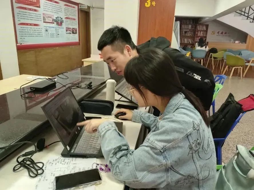 学生党员在南区学生一站式服务中心一楼,举行“REVIT、AutoCAD软件学习使用交流”志愿服务活动。