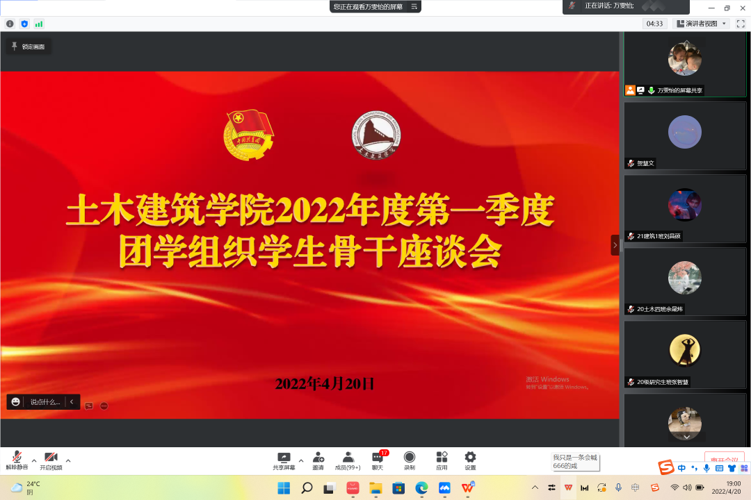 接下来,万雯怡老师就含羞草 四月团支部工作进行解读与布置:一是深入开展“喜迎二十大、永远跟党走、奋进新征程”主题教育活动;二是规范开展团员发展和群团推优工作;三是持续开展“抗疫有我”志愿活动。并对全体团员青年在本次疫情防控期间积极参加志愿活动,提出表扬和感谢,希望同学们能继续贡献青春力量,服务好学校疫情防控工作。