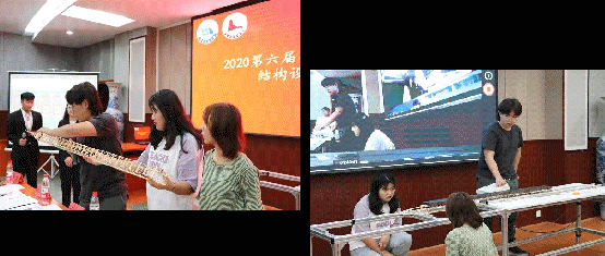 该组成员分别是:易钰清、郑思源、刘玥,该组采用梯形截面,通过测试发现问题,在承重比较大的地方加了连杆增加模型的抗压能力。他们提到之前的模型由于高度过高会出现侧翻所以在容易侧翻的地方加连杆。在加载过程中该组员对加载块谨慎摆放,一丝不苟,最后该组模型顶推成功,评委老师也进行了认可。
