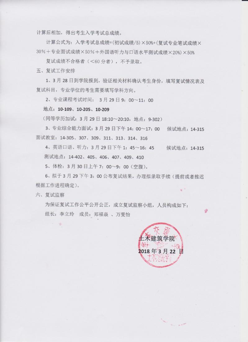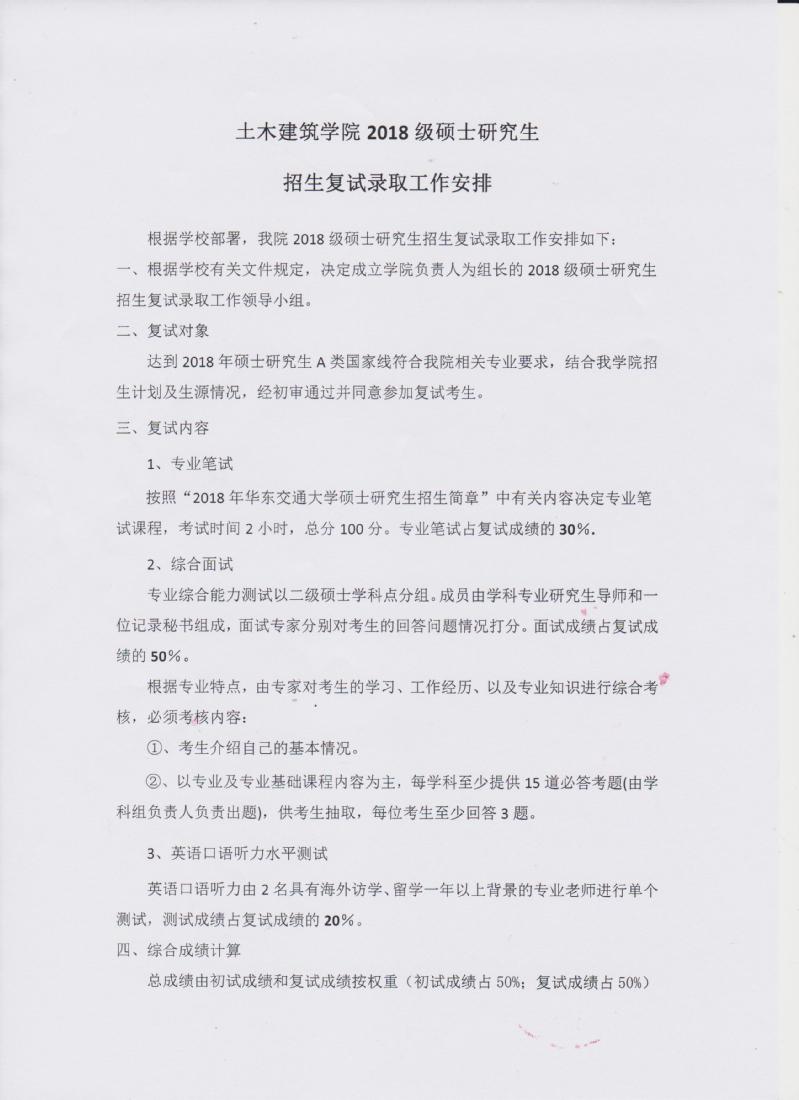 土建学院2018级硕士研究生招生复试工作安排