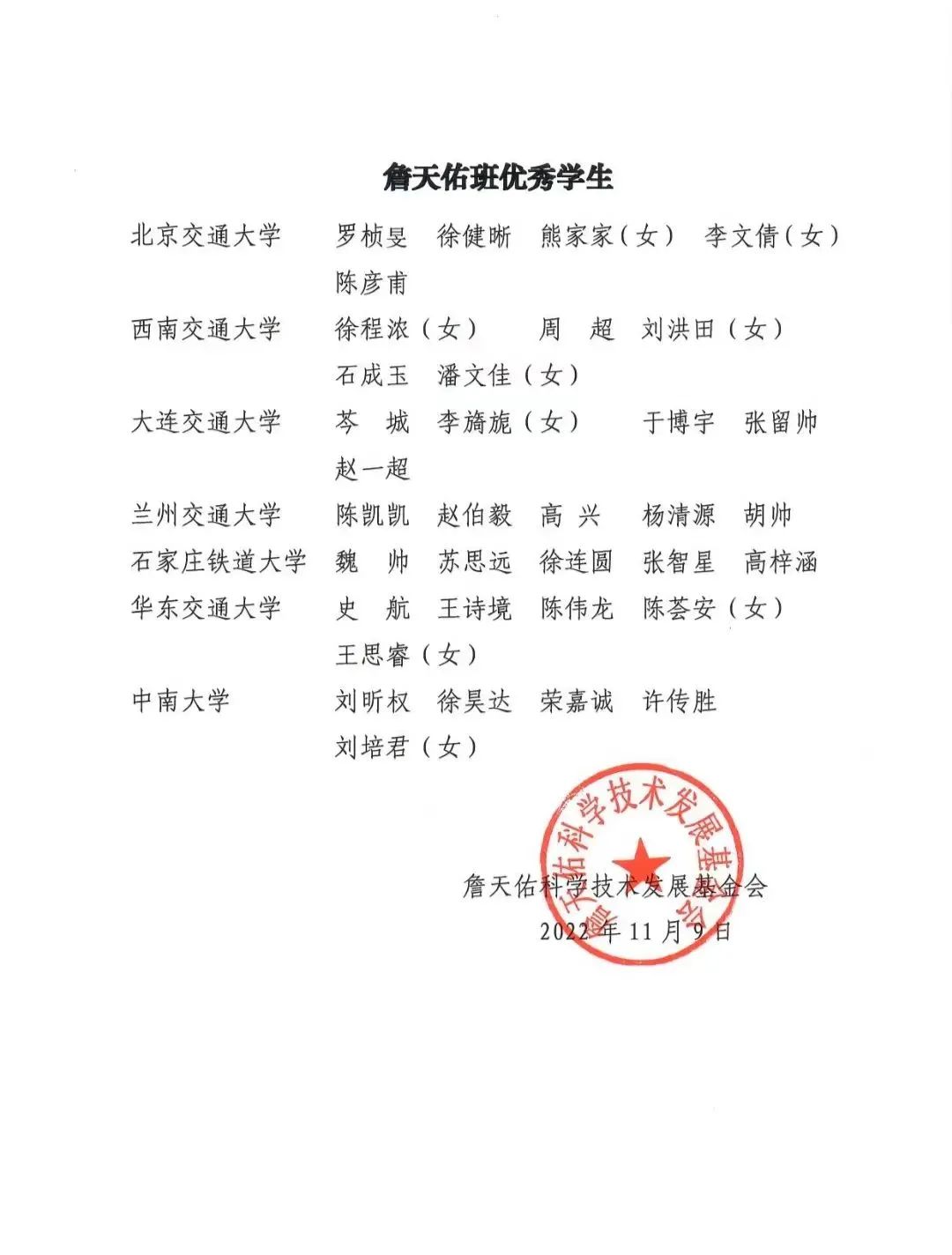 根据詹天佑科学技术发展基金会《詹天佑班管理办法》,经各学校推荐,詹天佑基金会秘书处审定,确定2022年度奖励詹天佑优秀班集体7个、詹天佑奖学金获得者35名。含羞草 2020级土木(城轨詹天佑)班获评2022年度詹天佑班优秀班集体,史航、王诗境、陈伟龙三名同学获评2022年度詹天佑班优秀学生。