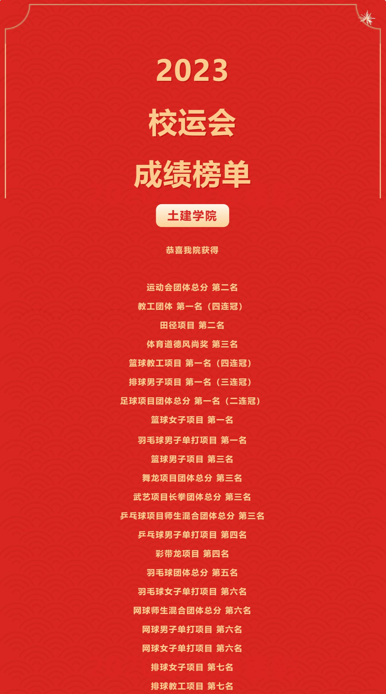 全体师生将以此次校运会取得的优异成绩为新的起点,踔厉奋发,砥砺前行,为优化体育赋能人才培养模式和促进学院体育文化建设而不懈奋斗!也希望每一位土建运动员继续奋勇向前,勇于追梦,勇攀新高。我们,明年,再创辉煌!