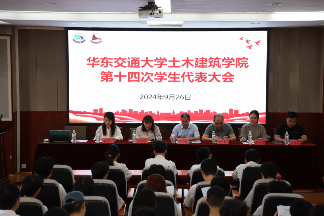 第十四次学生代表大会在土建楼200召开。院党委书记刘永胜,党委副书记郑轶,院团委书记万雯怡,团委副书记华罗娟、贺慧文,团委兼职副书记严安迪出席会议,第四十一任主席团成员、学生代表与会,会议由万雯怡主持。